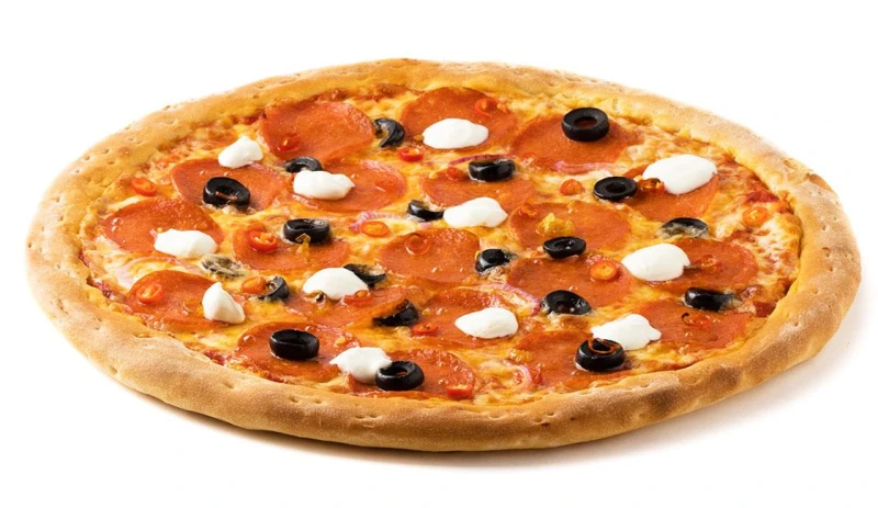 соус томатный, сыр моцарелла, красный лук, пепперони, маслины, чили перчик, сметана
