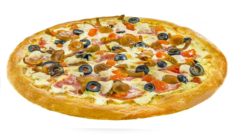 фирменный белый соус, сыр моцарелла, куриное филе, ветчина, опята маринованные, помидоры, маслины