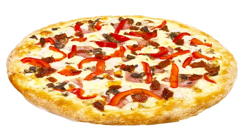 фирменный белый соус, сыр моцарелла, куриное филе, ветчина, обжареные лесные грибы, маринованный болгарский перец, вяленные томаты