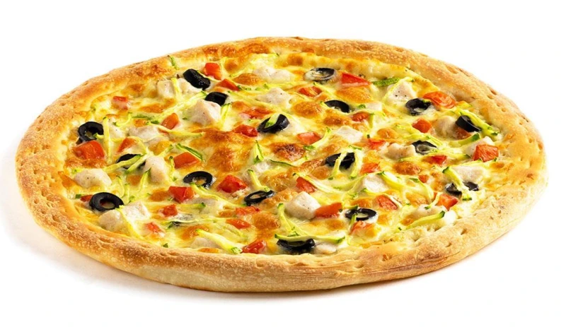 Фирменный белый соус, сыр моцарелла, куриное филе, помидоры, маслины, цуккини
