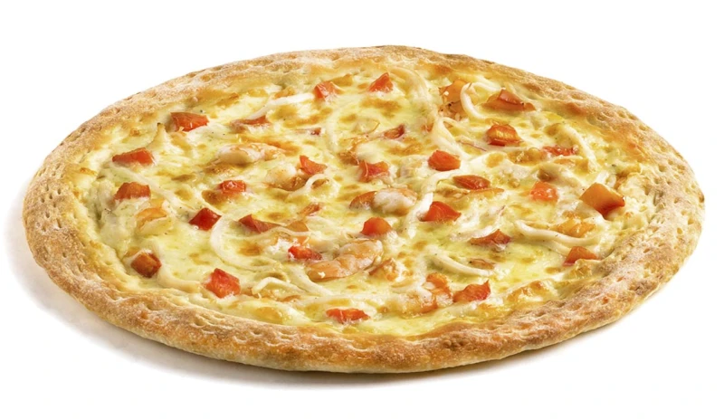 фирменный белый соус, сыр моцарелла, креветки, кальмары, помидоры